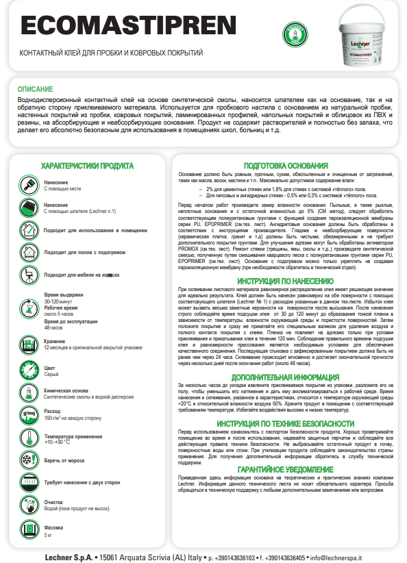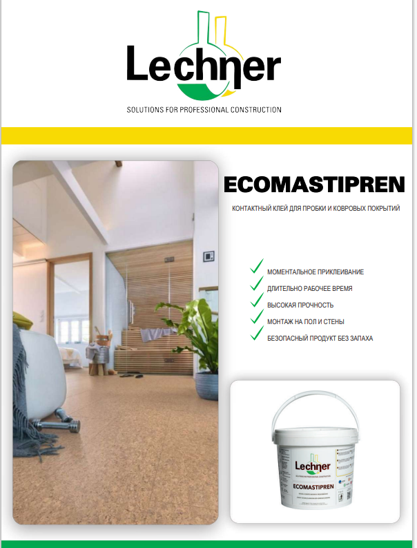 Воднодисперсионный контактный клей на основе синтетической смолы, наносится шпателем как на подложку, так и на обратную сторону приклеиваемого материала, используется для пробочного настила с основанием из натуральной пробки, настенных покрытий из пробки, ковровых покрытий, ламинированных профилей, напольных покрытий и облицовок из ПВХ и резины, на абсорбирующие и неабсорбирующие основания. Не содержит растворителей и полностью без запаха, обеспечивает исключительную производительность, а также делает продукт абсолютно безопасным для использования в помещениях школ, больниц.